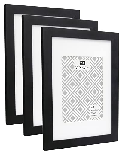 A4 Black Photo Frames With Acid Free Mount for A5(8x6) Set Of 3, Garllery A4 Ducoment Picture Frames 3 Packs, 8 x 6 '' Picture frames with a delicate Wooden grain texture For Wallmounted & Desk Top