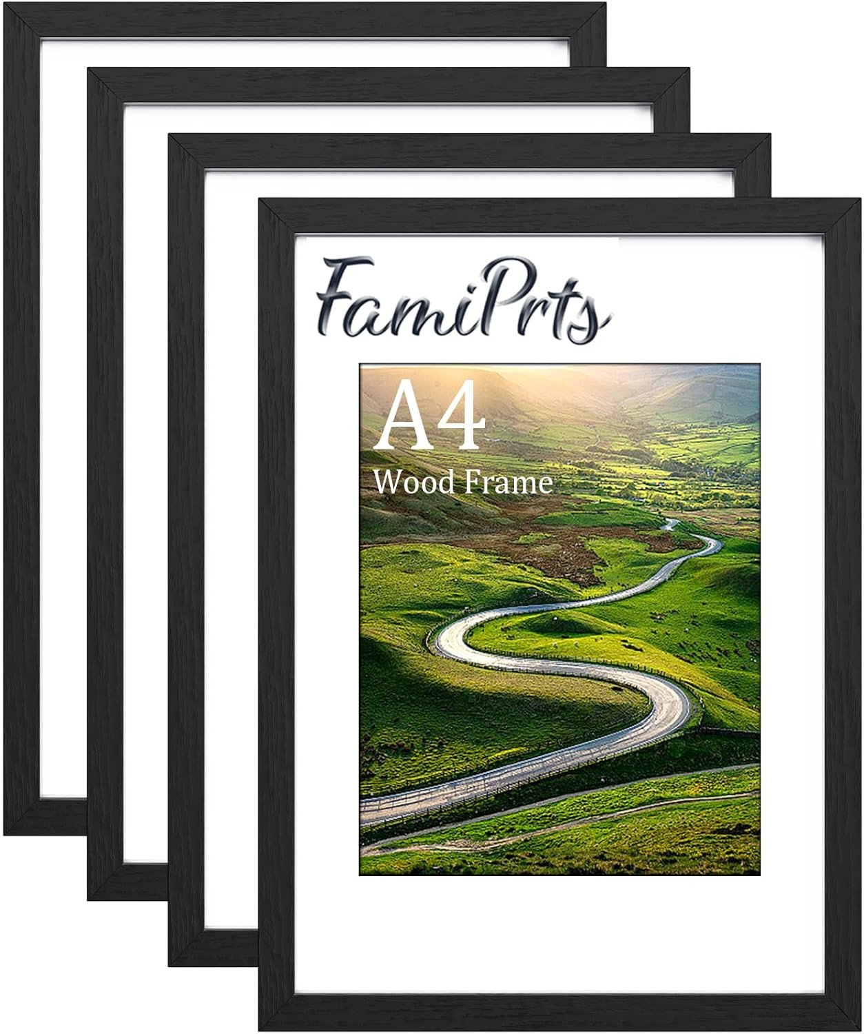 FamiPrts 4Pack A4 Frame, Wooden A4 Picture Frames, Versatile Black A4 Frame, Dual Orientation (Landscape/Portrait), Includes Stand & Wall Hooks - Wall Mount or Tabletop for Home, Office, Gallery