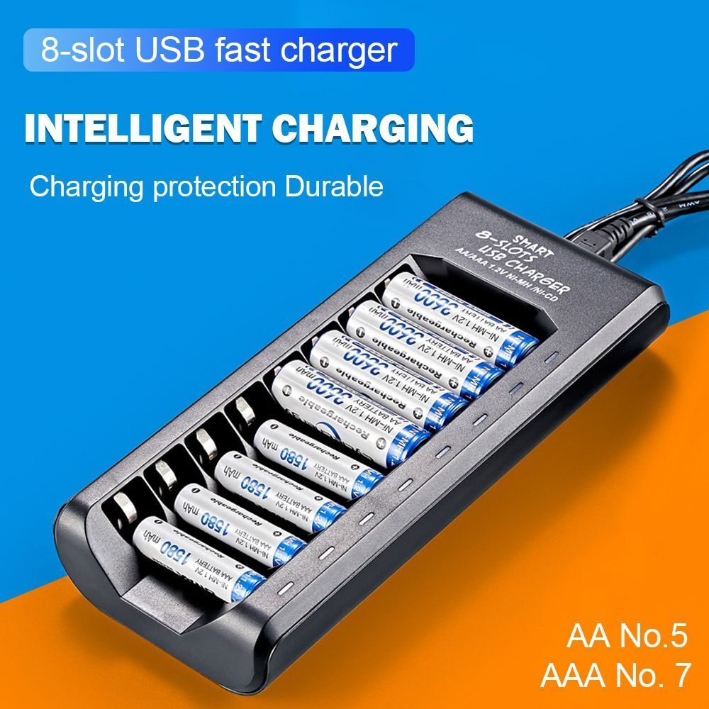 AA AAA Battery Charger 8 Bay, Independent Slot, USB Fast Charging for Ni-Mh Ni-C
