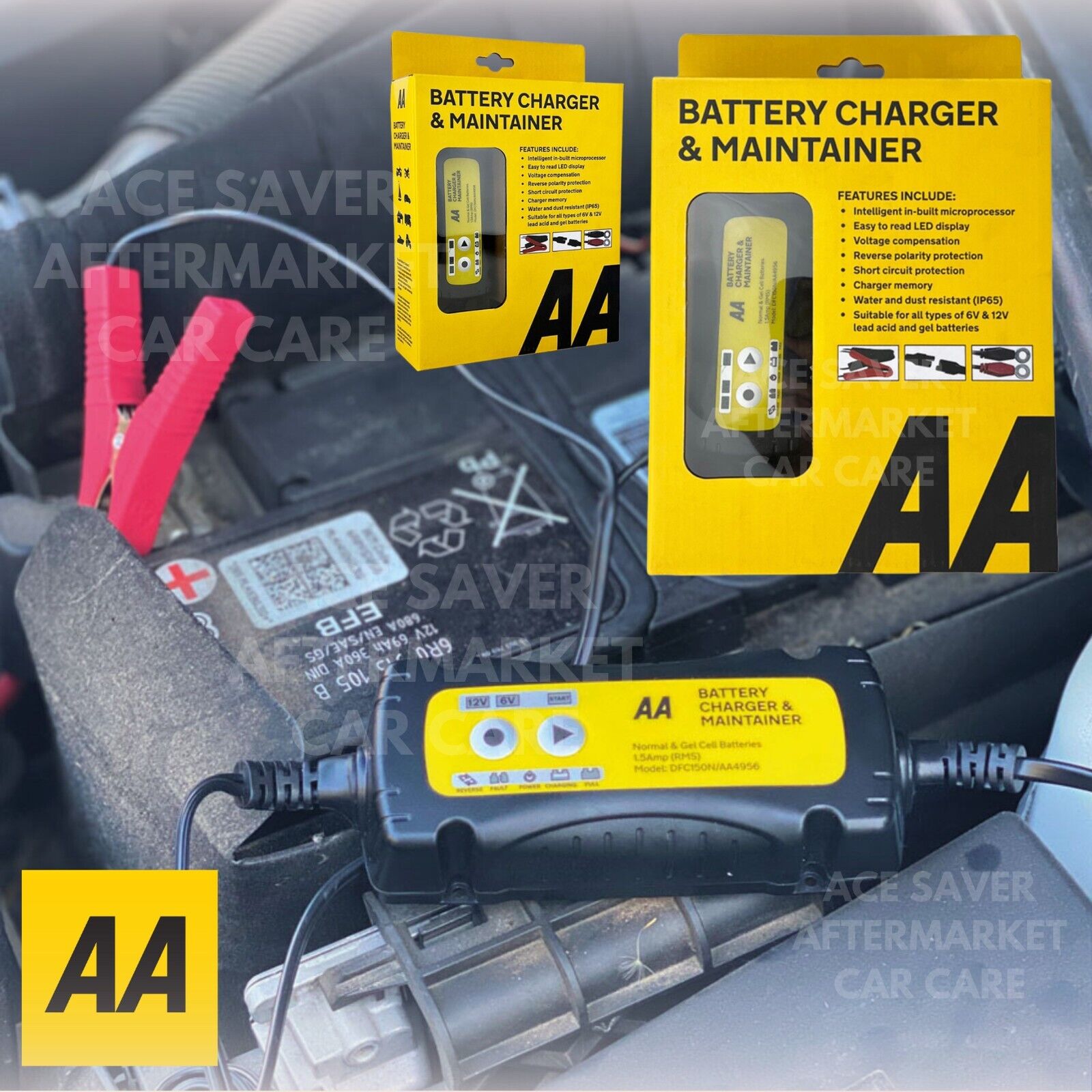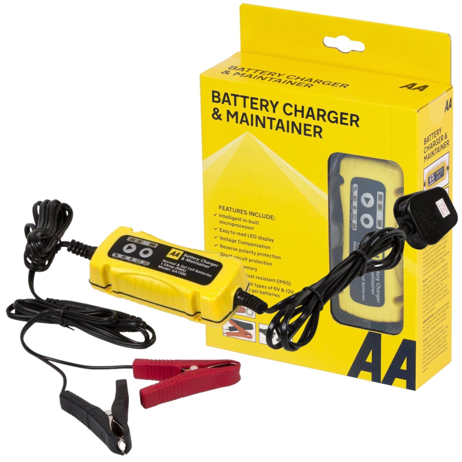 AA Smart Battery Charger Maintainer 1.5A for 6V & 12V Lead Acid, Black & Yellow