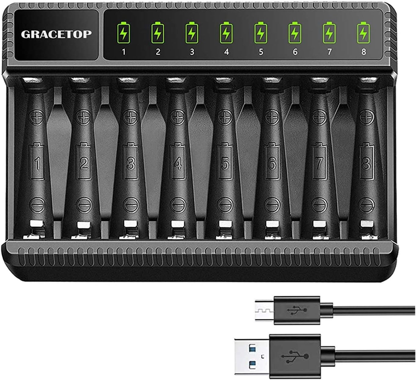 8 Bay AA AAA Battery Charger (USB High-Speed Charging, Independent Slot) for Ni