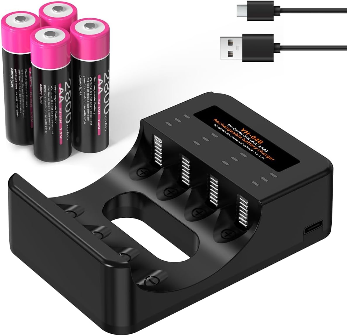 HiQuick 8 x AA Rechargeable Batteries with Battery Charger, Type-C Input 8 Slots LED AA AAA Battery Charger with 8 2800mAh Rechargeable Batteries