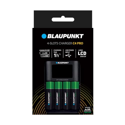 Blaupunkt Advanced USB charger for 1-4 AA/AAA Rechargeable Batteries, with LCD, 1h charging time, 4 Blaupunkt AA Batteries Included (2000 mAh)
