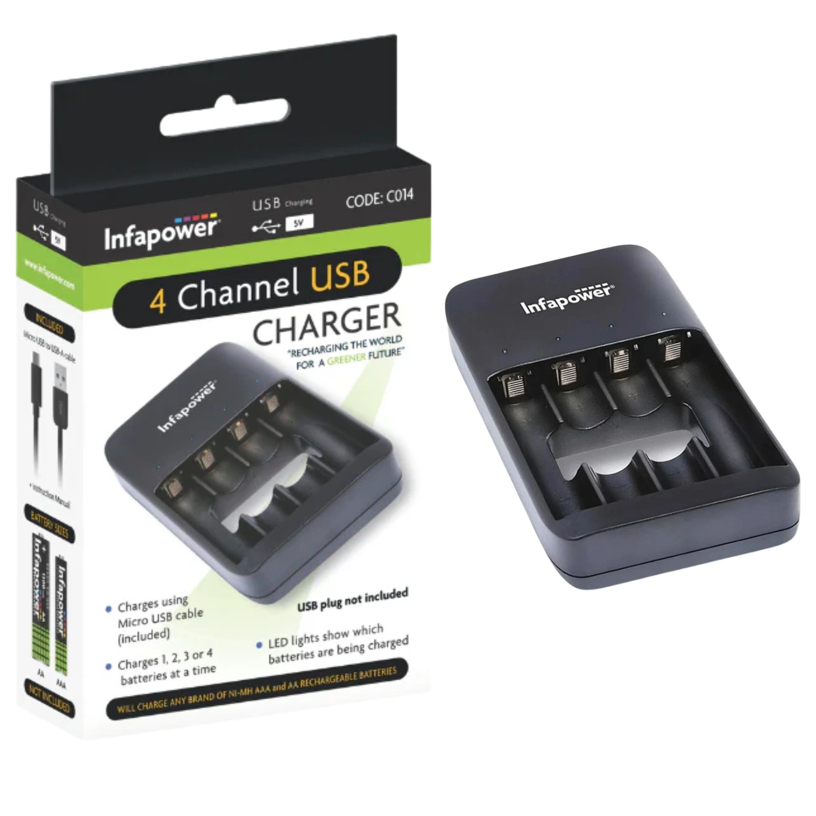 Infapower 4 Channel AA & AAA Battery Charger with USB Cable Ni-MH Black