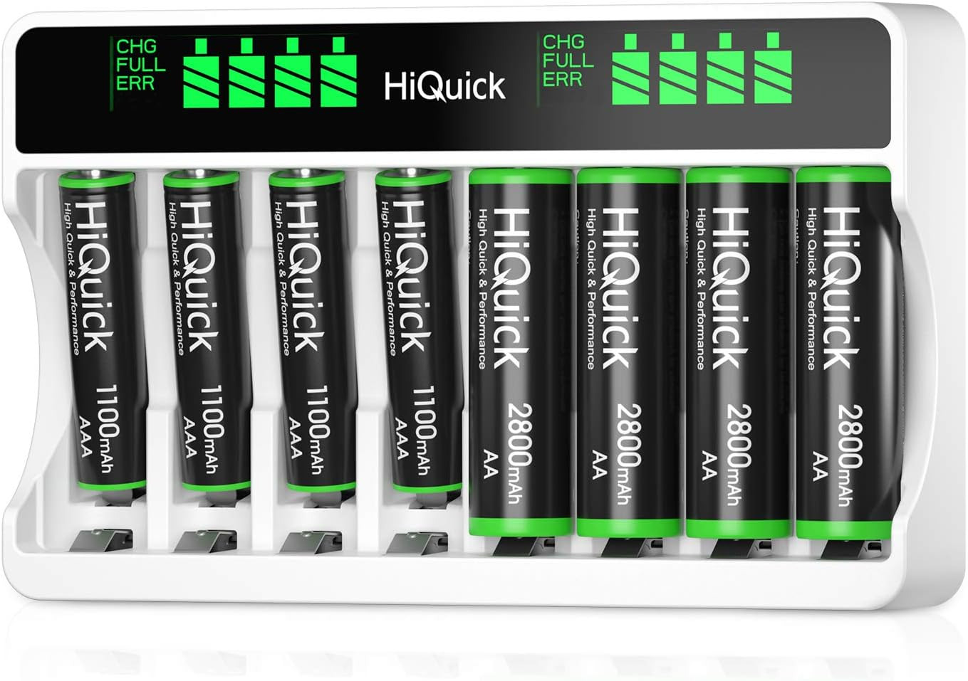 HiQuick 8-slot AA AAA LCD Battery Charger, 5V 2A Fast Charging Function, Type C and Micro USB Input, with 4 x 2800mAh AA and 4 x 1100mAh AAA NI-MH Rechargeable Batteries, Battery and Charger Set