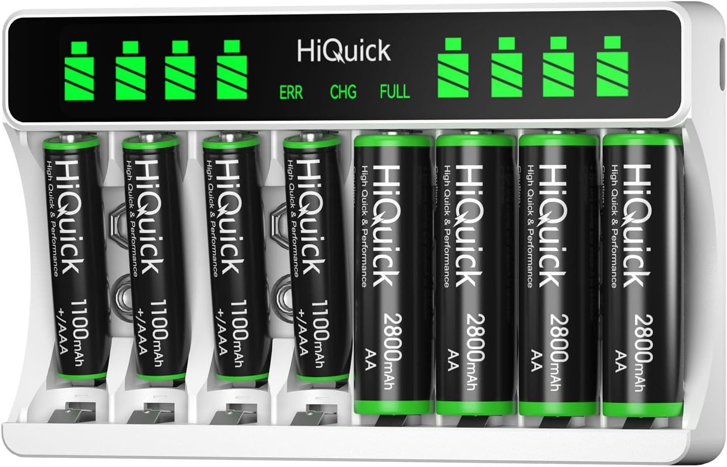 HiQuick 8-slot AA AAA LCD Battery Charger, 5V 2A Fast Charging Function, Type C Input with 4 x 2800mAh AA and 4 x 1100mAh AAA NI-MH Rechargeable Batteries, Battery and Charger Set