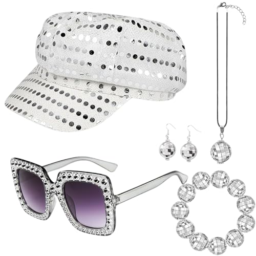 TAIXING 5 Pcs Abba Accessories, 70s Disco Accessories for Women, Disco Costume Set with Sequin Glitter Hat, Bling Sunglasses, Retro Earrings, Abba Dress Up for Theme Party, Dance & Birthday (Silver)