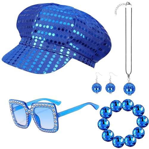 TAIXING 5 Pcs Abba Accessories, 70s Disco Accessories for Women, Disco Costume Set with Sequin Glitter Hat, Bling Sunglasses, Retro Earrings, Abba Dress Up for Theme Party, Dance & Birthday (Blue)