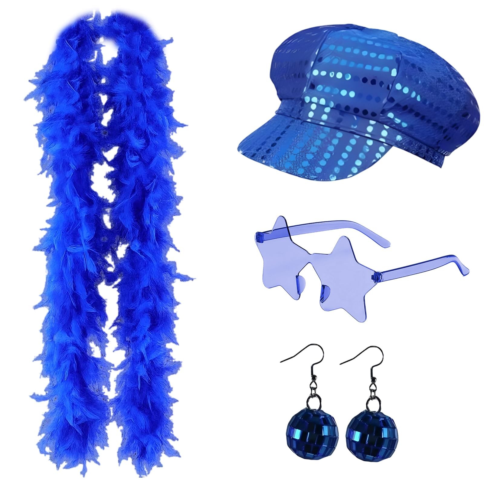Abba Accessories, 4-Piece Disco Party Set, Retro Style Sequin Hat, Feather Boa, Star Glasses, Funky Earrings for Themed Events, Dance Performances, Halloween and Music Festivals