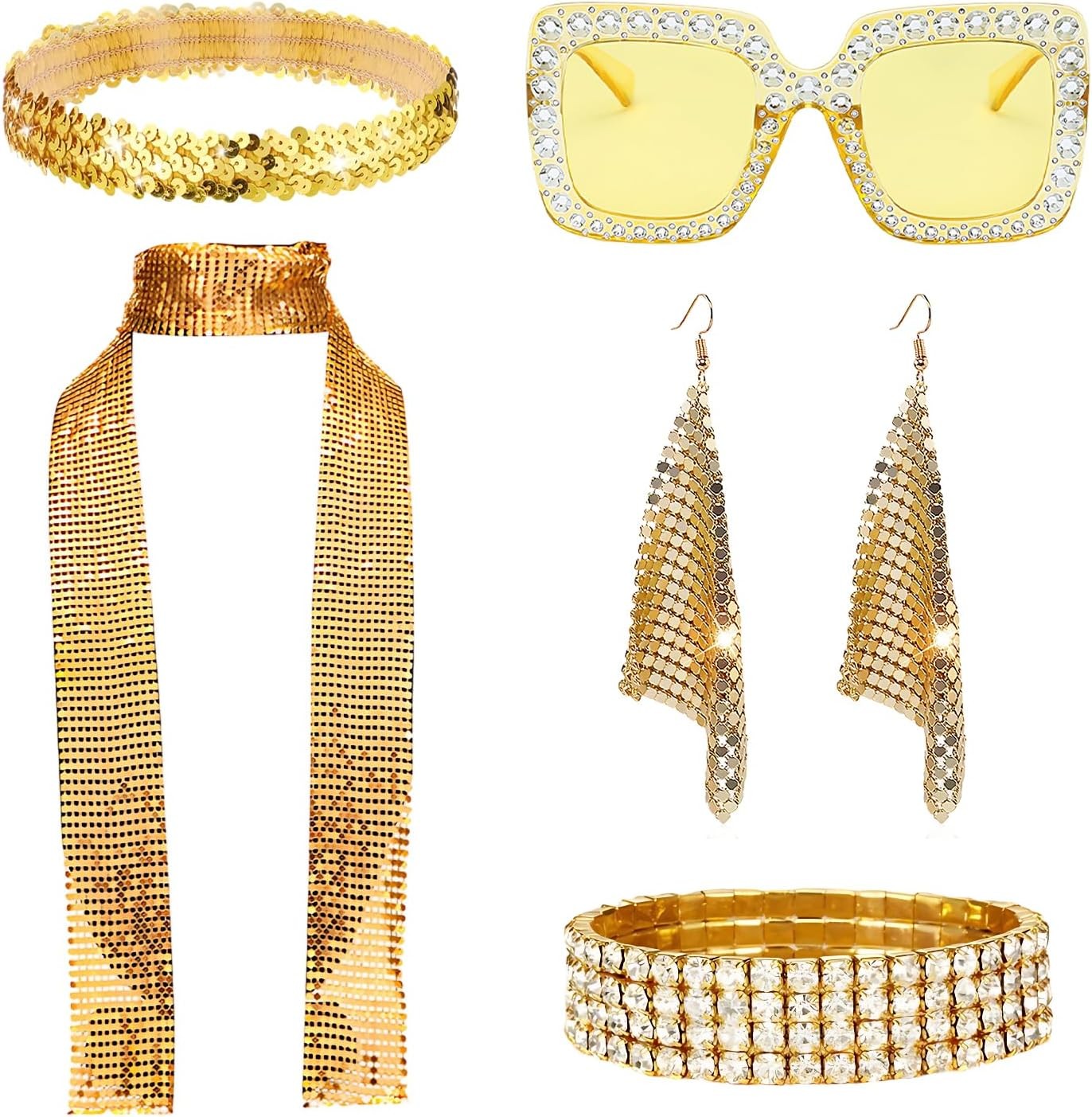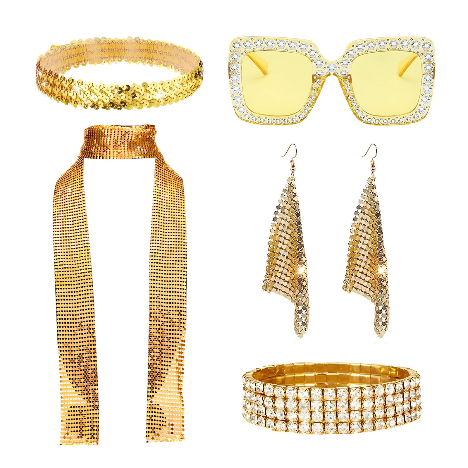 TZMFHD 70s Accessories for Women, Abba Accessories, 6 Pcs 70s 80s Disco Golden Accessories Set, ABBA Fancy Dress Costume, Retro Party Glitter Scarf Earrings Headband for Disco Theme Nights