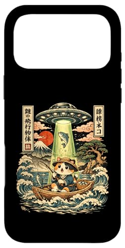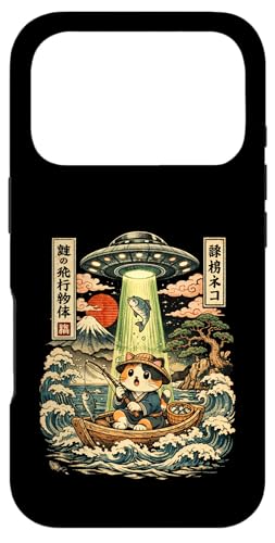 Kawaii Fishing Cat Alien UFO Abduction Vintage Ukiyo-e Case for iPhone 17 Pro