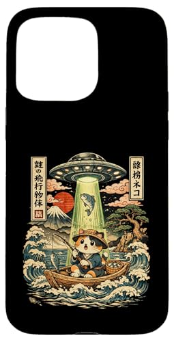 Kawaii Fishing Cat Alien UFO Abduction Vintage Ukiyo-e Case for iPhone 15 Pro Max