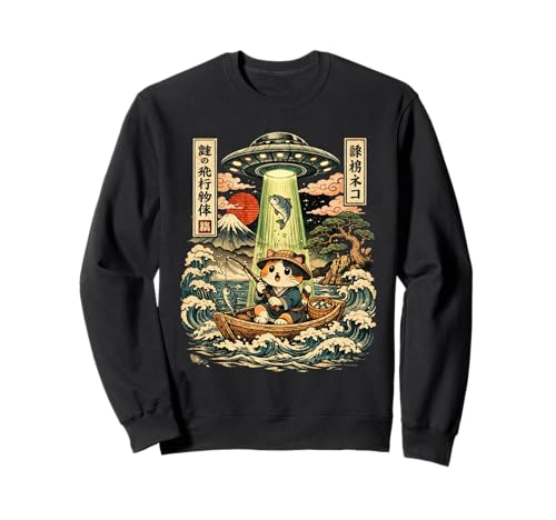 Kawaii Fishing Cat Alien UFO Abduction Vintage Ukiyo-e Sweatshirt
