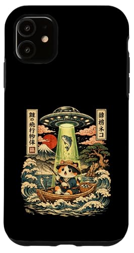 Kawaii Fishing Cat Alien UFO Abduction Vintage Ukiyo-e Case for iPhone 11