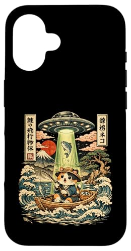 Kawaii Fishing Cat Alien UFO Abduction Vintage Ukiyo-e Case for iPhone 16