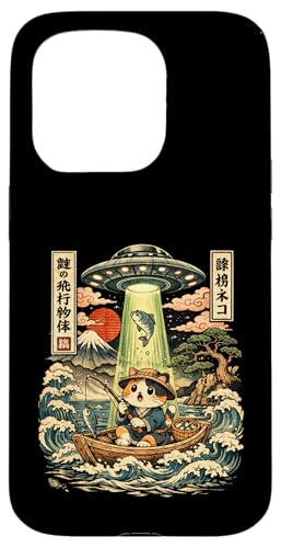 Kawaii Fishing Cat Alien UFO Abduction Vintage Ukiyo-e Case for iPhone 15 Pro