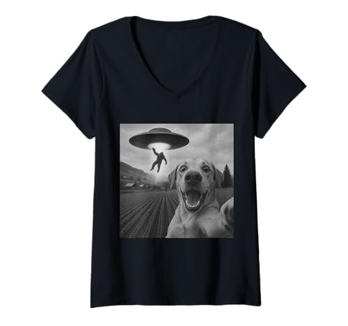 Women's Bigfoot UFO Abduction Dog Selfie - Funny Alien Sci Fi V-Neck T-Shirt