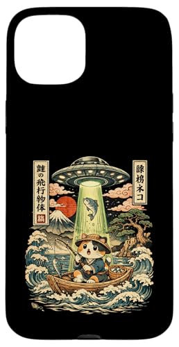 Kawaii Fishing Cat Alien UFO Abduction Vintage Ukiyo-e Case for iPhone 15 Plus