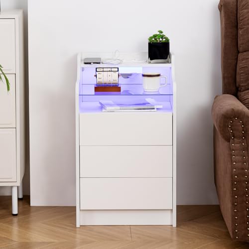 Led Bedside Table with 2 AC Outlets, 2 USB Ports, White Gloss Bedroom Unit Sofa Table with 3 Drawers, 16 Colors RGB LED Nightstand Cabinet, 45 x 35 x 76cm