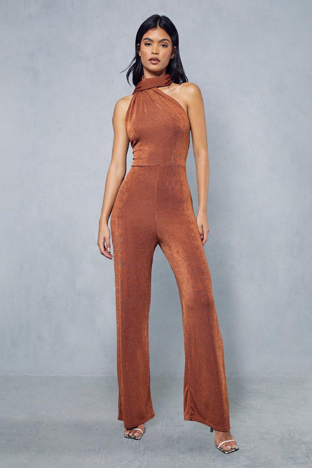 Acetate Slinky Draped Choker Neck Low Back Jumpsuit