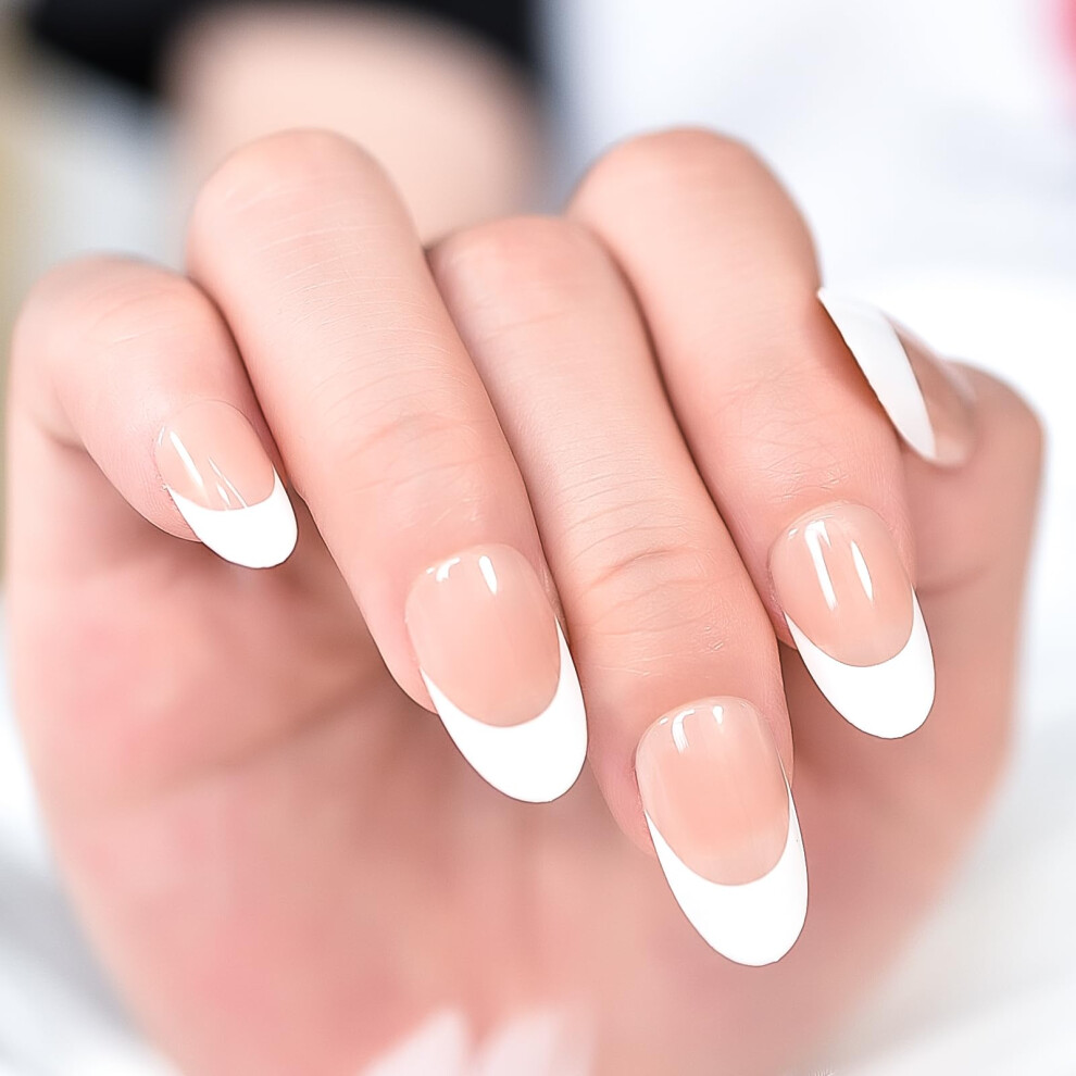 Almond Press on Nails with Glue, Medium French Tip Fake Nails, Reusable Acrylic Manicure Set 24pcs