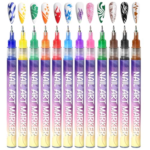 TANGHSE 12 Colours Nail Art Pens Set - Fine Tip Nail Art Marker for Real Nails & Acrylic, Nails Polish Pen Painting Graffiti Drawing Pen for Manicure Arts DIY for Women Girls