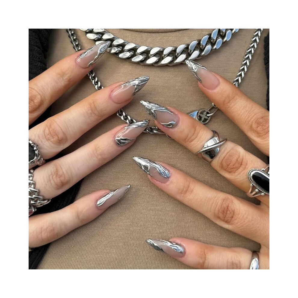 Medium Almond Press on Nails 3D French Silver Fake Nails Reusable Acrylic Manicure Set 24Pcs