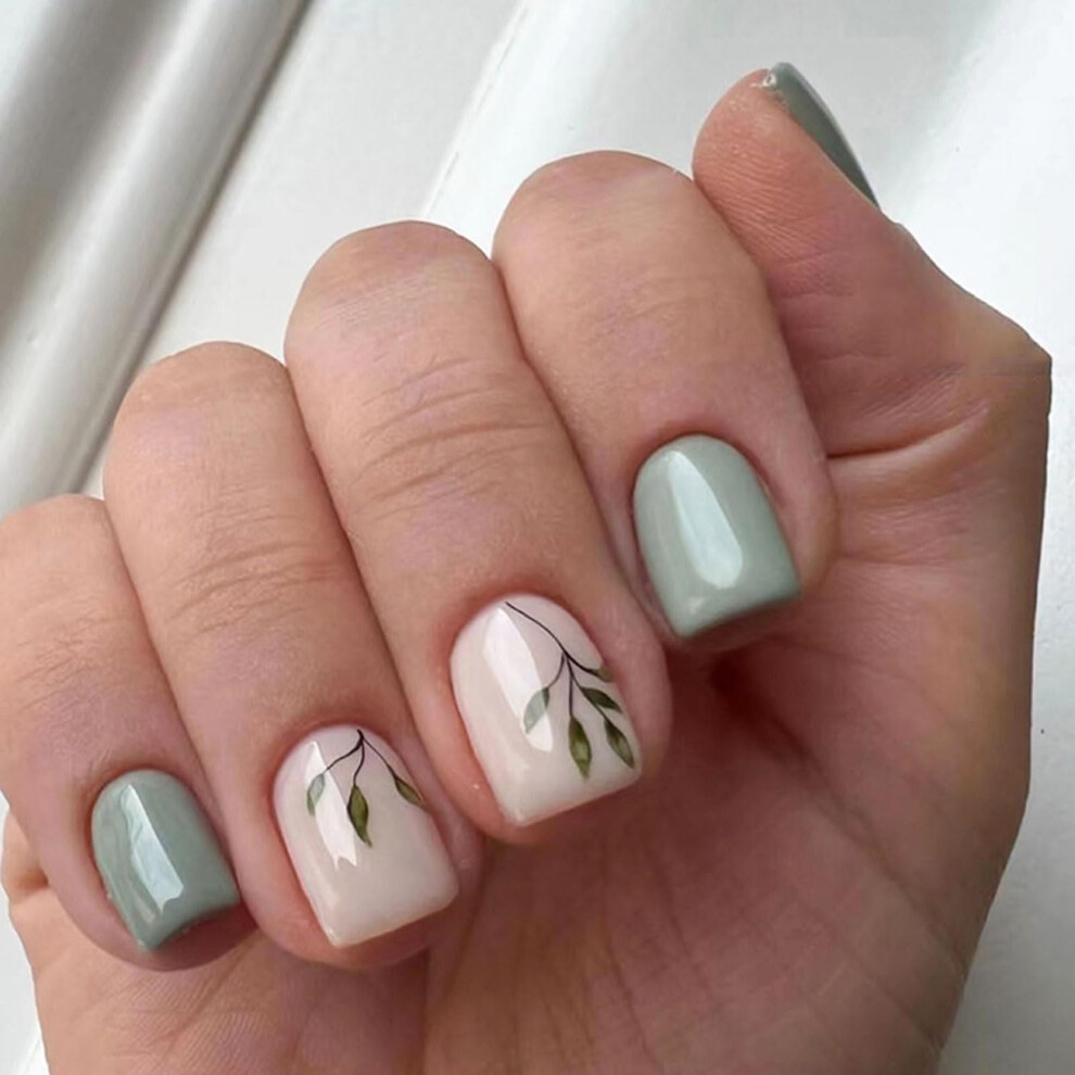 Short Square Press On Nails Floral Fake Nails Set Green and Pink Acrylic Complete Manicure Kit 24Pcs