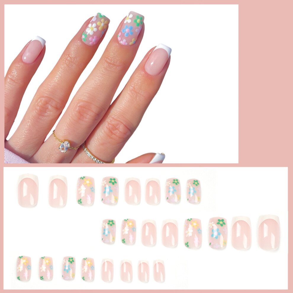 Short Square Press on Nails Flower Design Fake Nails Glossy Acrylic Instant Salon Manicure Kit
