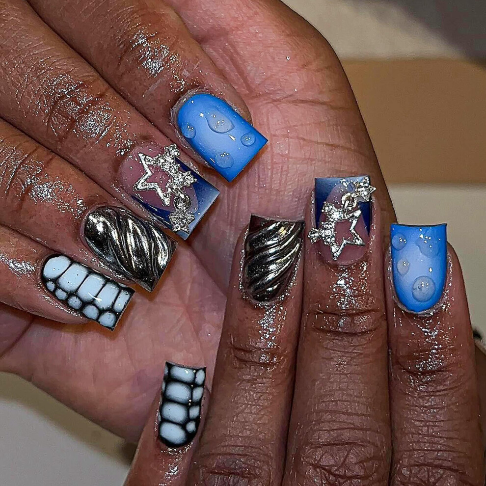 Long Coffin Press On Nails 24pcs with 3D Water Droplet Design, Glossy Reusable Acrylic Manicure Kit