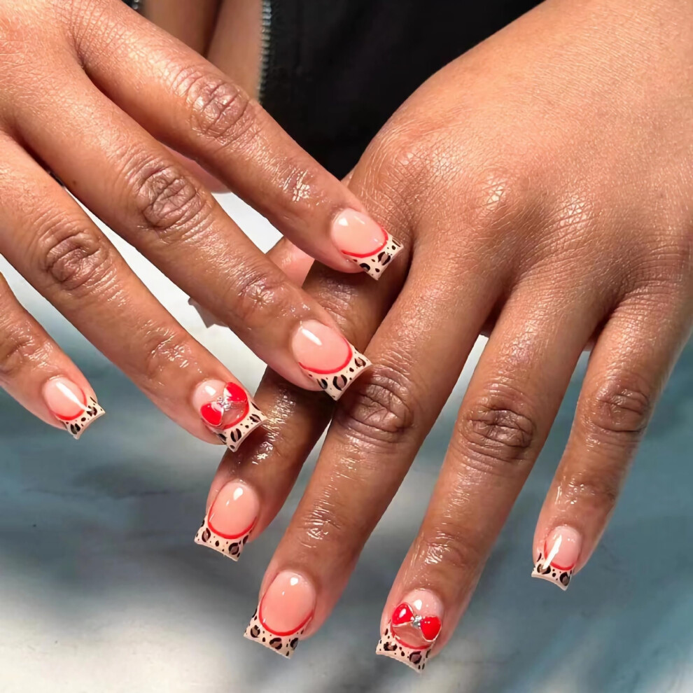 Short Square Press On Nails Brown Cheetah French Tip with Red Bow Charm Acrylic Complete Manicure Kit