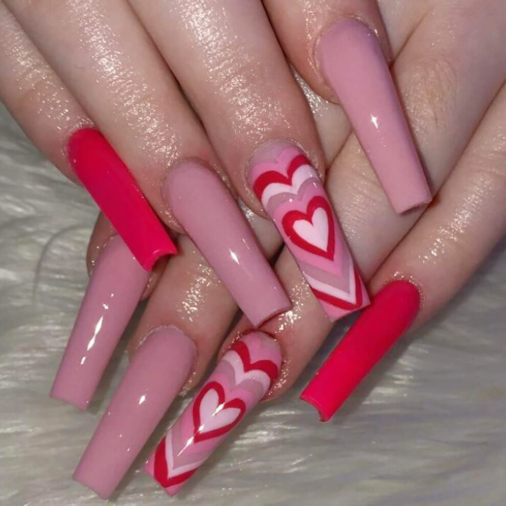 Long Coffin Press On Nails Red Heart Design Fake Nails Glossy Acrylic Reusable Manicure Set
