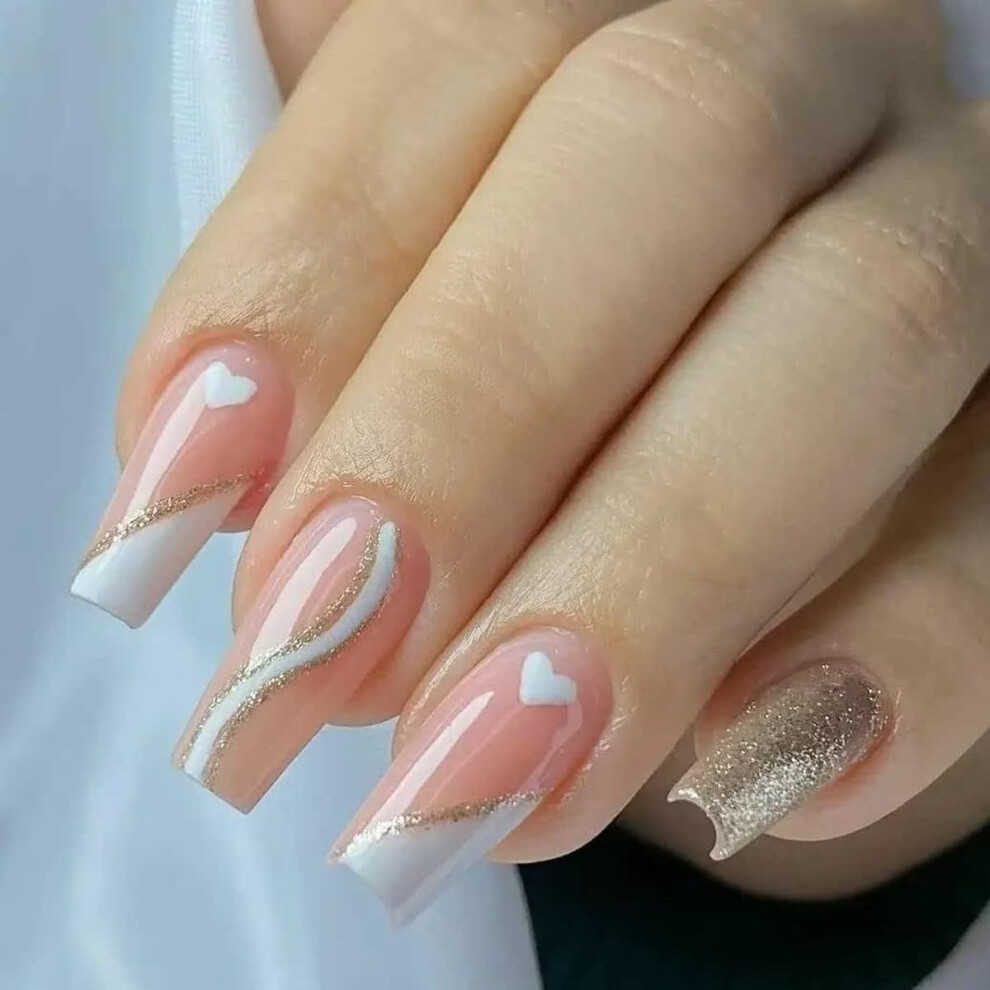Press On Nails Long Square French Tips Gold Glitter Reusable Acrylic DIY Manicure Set 24pcs