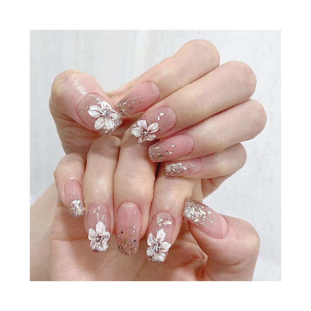 24 PCS Short Square Press on Nails Ombre Nude with Glitter Floral Full Cover Acrylic Manicure Kit