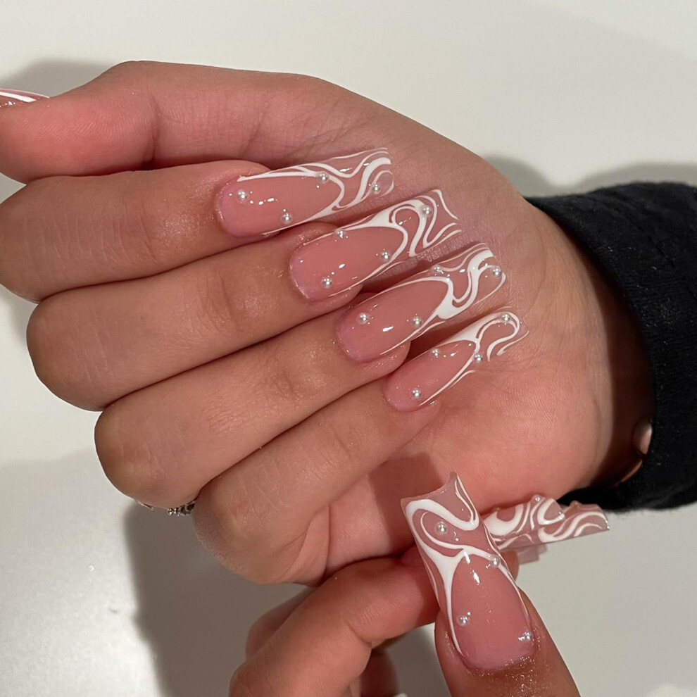 Long Square French Tip Press On Nails with White Wave Design, Pearl Charms and Rhinestones, Extra Long Acrylic Manicure Set