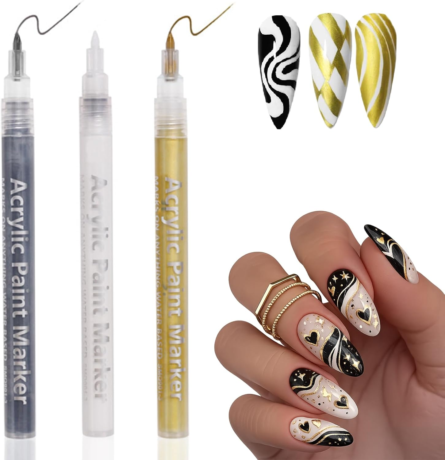 3 Colors Acrylic Nail Art Pens Set – Black White Gold Fine Tip Quick Dry Polish