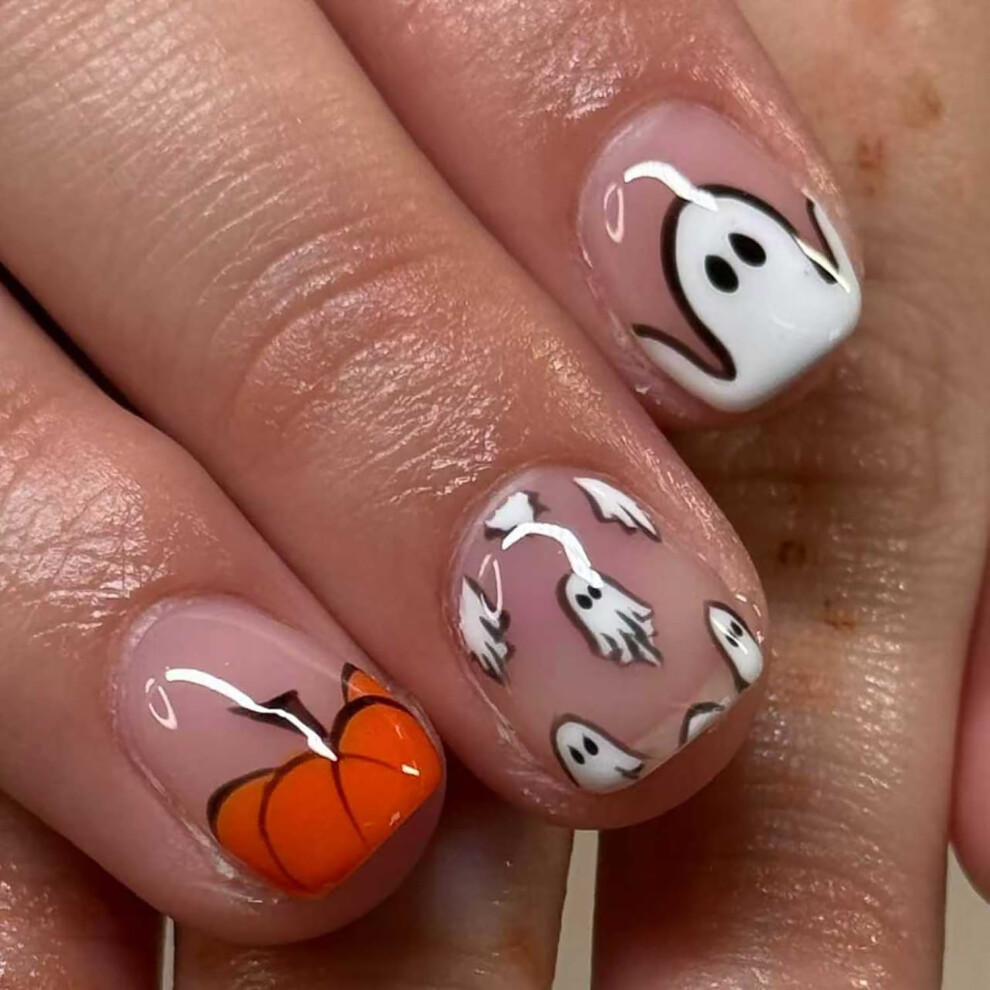 Halloween Press On Nails Short Square with Pumpkin and Ghost Designs, Reusable Acrylic False Nails Kit 24Pcs