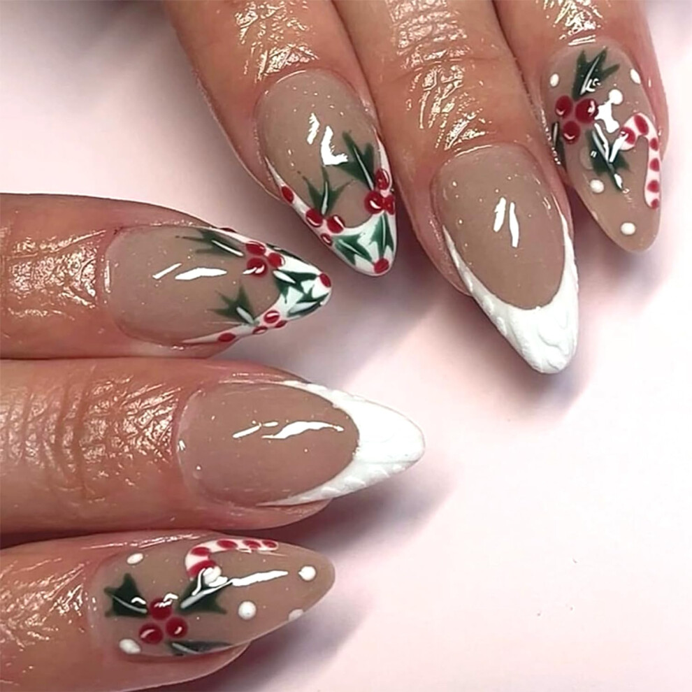 Christmas Press On Nails Set Almond Shape White French Tip Reusable Acrylic False Nails Kit
