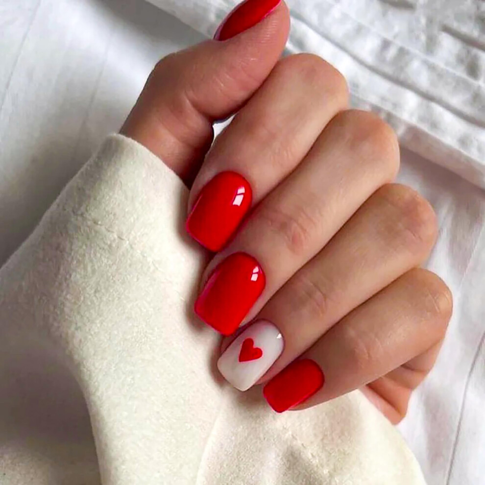 Short Square Press On Nails White with Red Heart Design, 24pcs Salon Quality Acrylic False Nails Kit