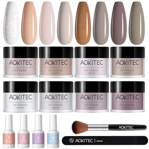 Aokitec 14Pcs Dip Powder Nail Kit for Starter, 8 Colors Collection, Acrylic Nail Dipping Powder Kit with Base Top Coat Activator Brush Saver for French Nails Art Manicure DIY Salon, Women Girls Gift