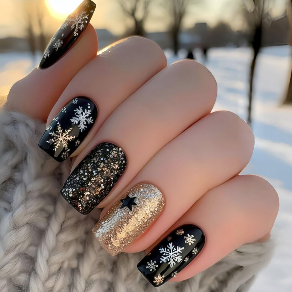 Christmas Press On Nails Black Gold Glitter Snowflake Design Reusable Square Acrylic Fake Nails Kit