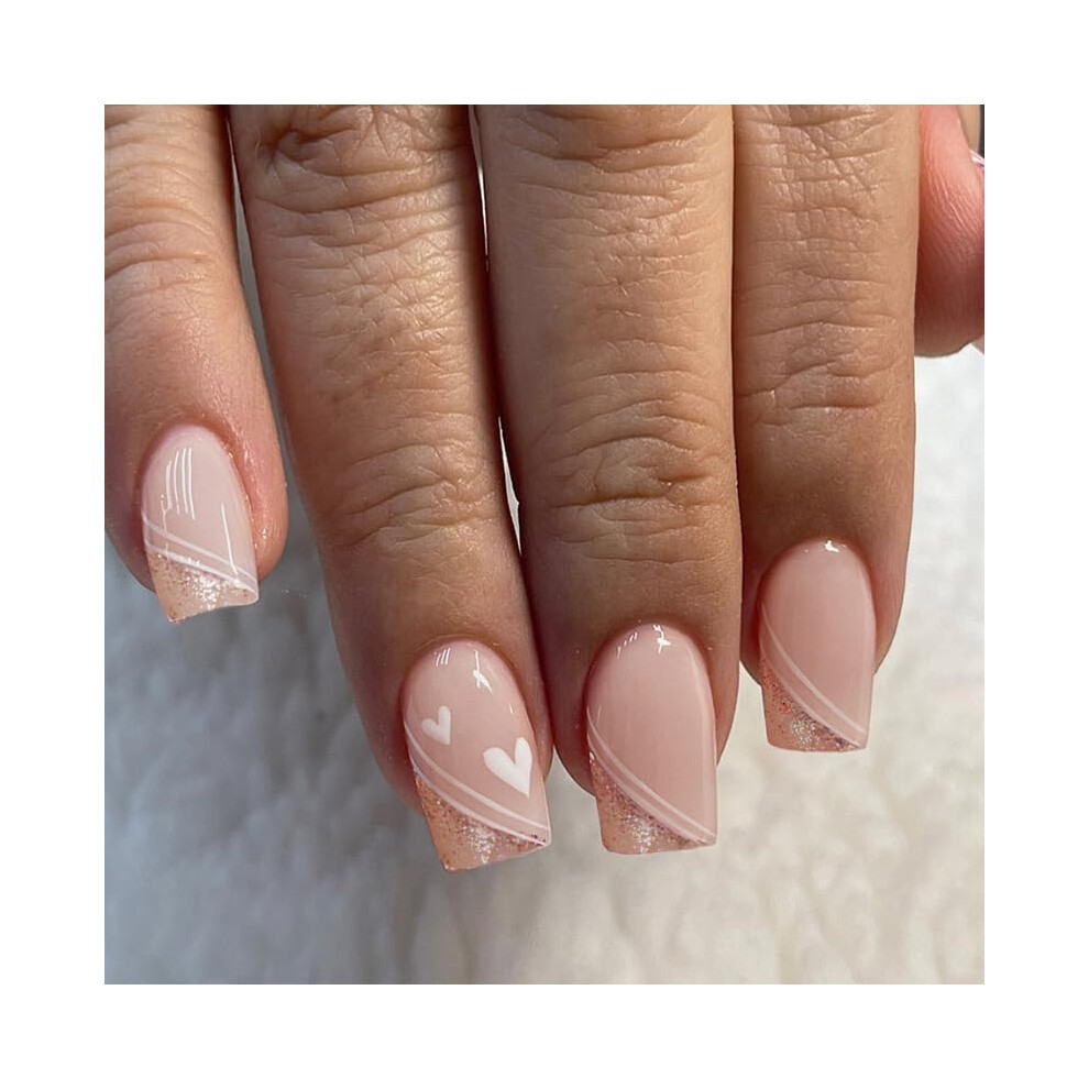24 Pcs Short Square Nude Press on Nails with Pink French Tips and Heart Design, Glossy Acrylic Fake Nails Kit