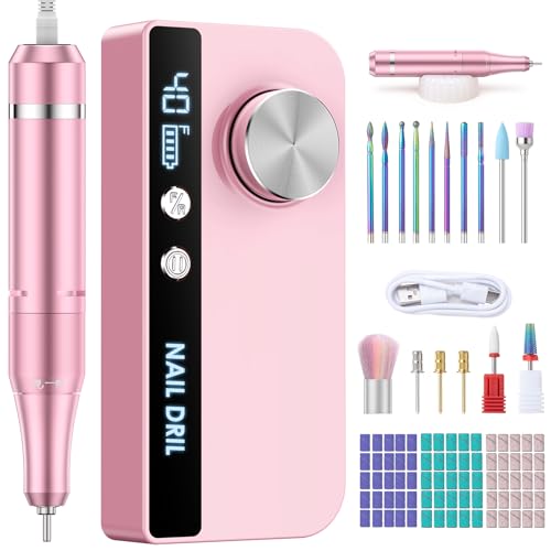 Denabuty Electric Nail Drill Cordless, 35000RPM Portable Electric Nail File with LCD Display and 12 Nail Drill Bits for Acrylic & Gel Nails, Professional Manicure & Pedicure Kit Set Pink