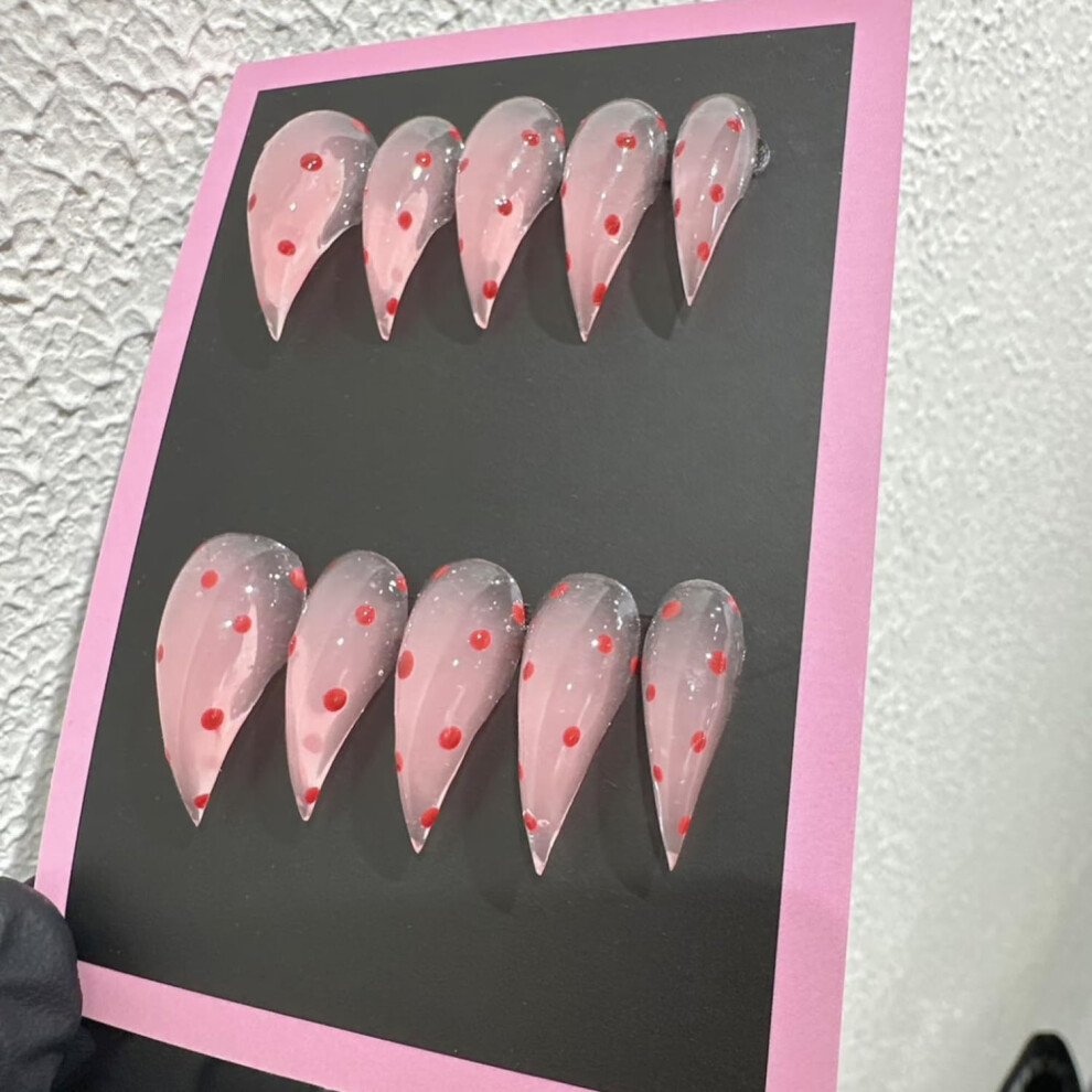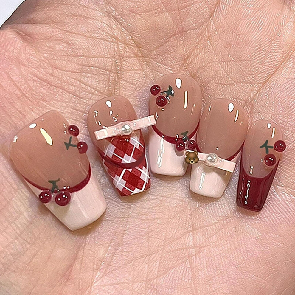 Glossy French Press On Nails with Cherry Bow, Full Cover Acrylic False Nails Kit for Women Small
