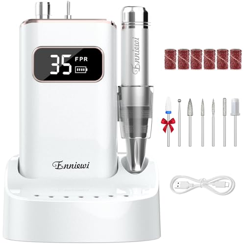Enniewi Nail Drill 35000 RPM, Portable Electric Nail File for Acrylic and Gel Nails, Rechargeable Professional Nail Drill Machine, Cordless E File Manicure Pedicure Kit for Home Salon, White