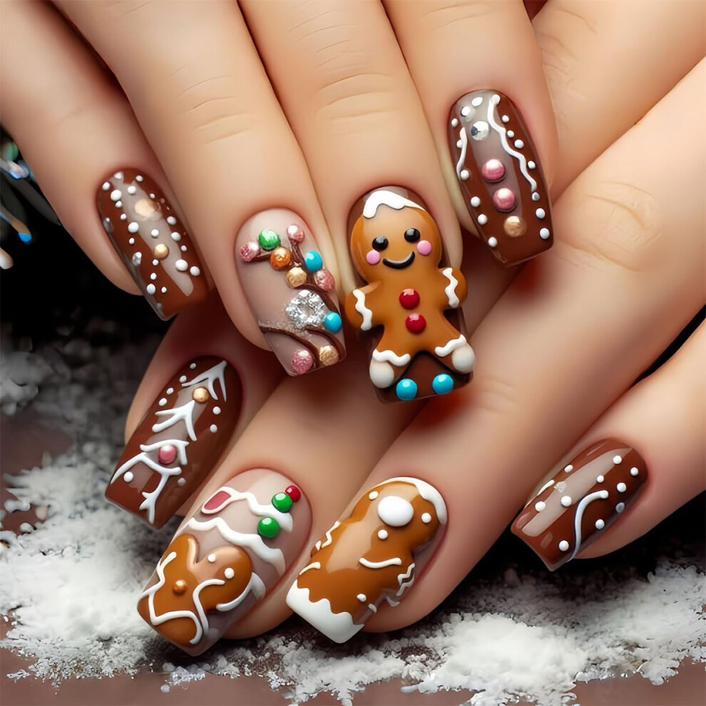 Christmas Press On Nails Square Acrylic Fake Nails Kit with Gingerbread Man Design 24Pcs