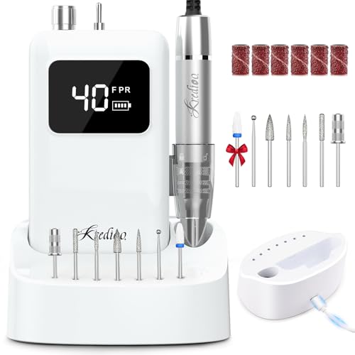 Kredioo Brushless Nail Drill 40,000RPM with 3-in-1 Charging Base Stand, Professional Low Noise Acrylic Gel Nails Electric Nail File, Home Salon Portable Manicure E File Kit, White