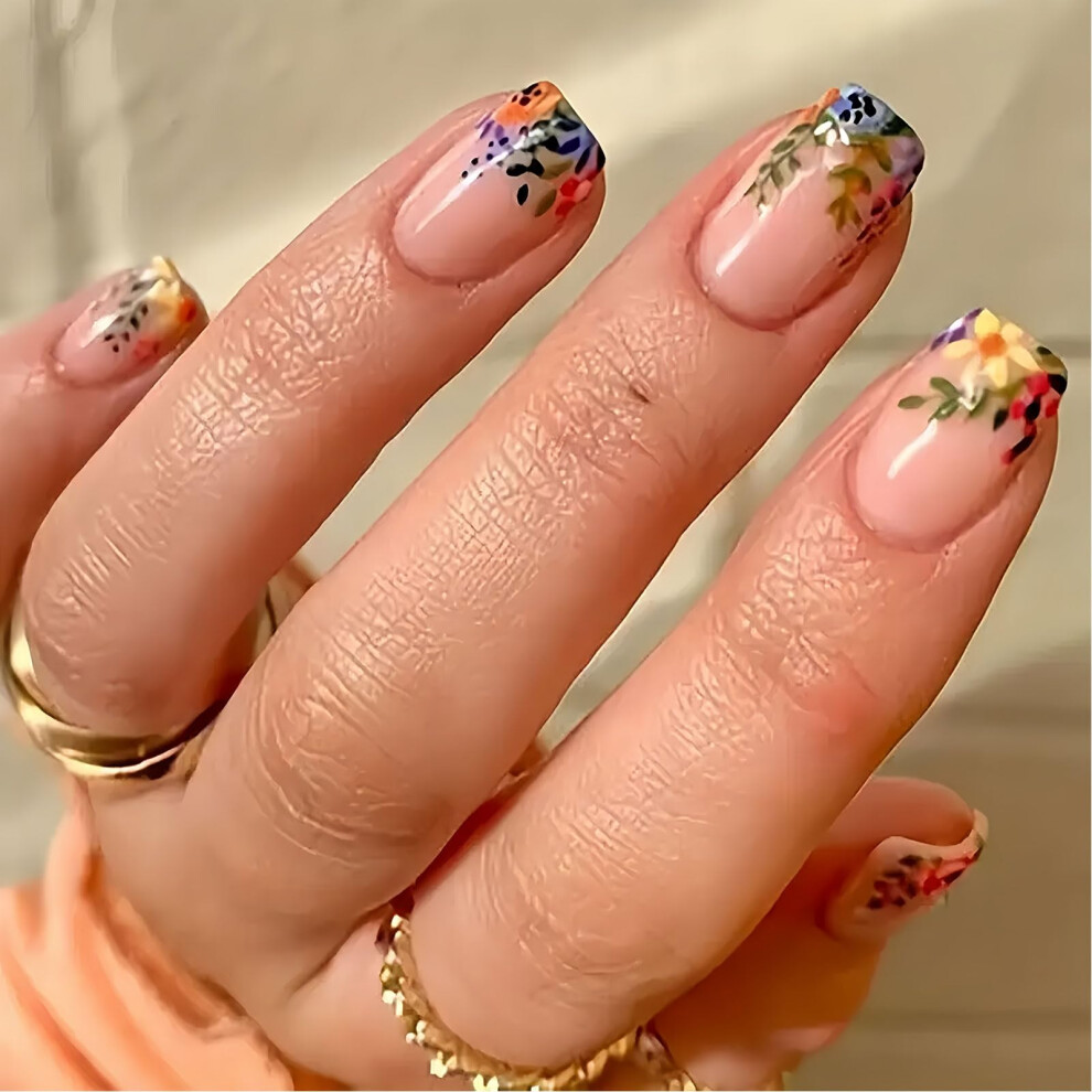 Short Square Floral Press On Nails Colorful Acrylic Fake Nails Kit for Spring Summer Women 24pcs