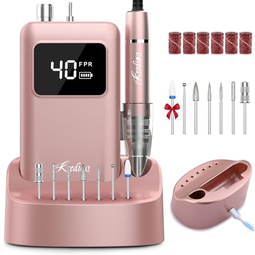 Kredioo Brushless Nail Drill 40,000RPM with 3-in-1 Charging Base Stand, Professional Low Noise Acrylic Gel Nails Electric Nail File, Home Salon Portable Manicure E File Kit, Gold