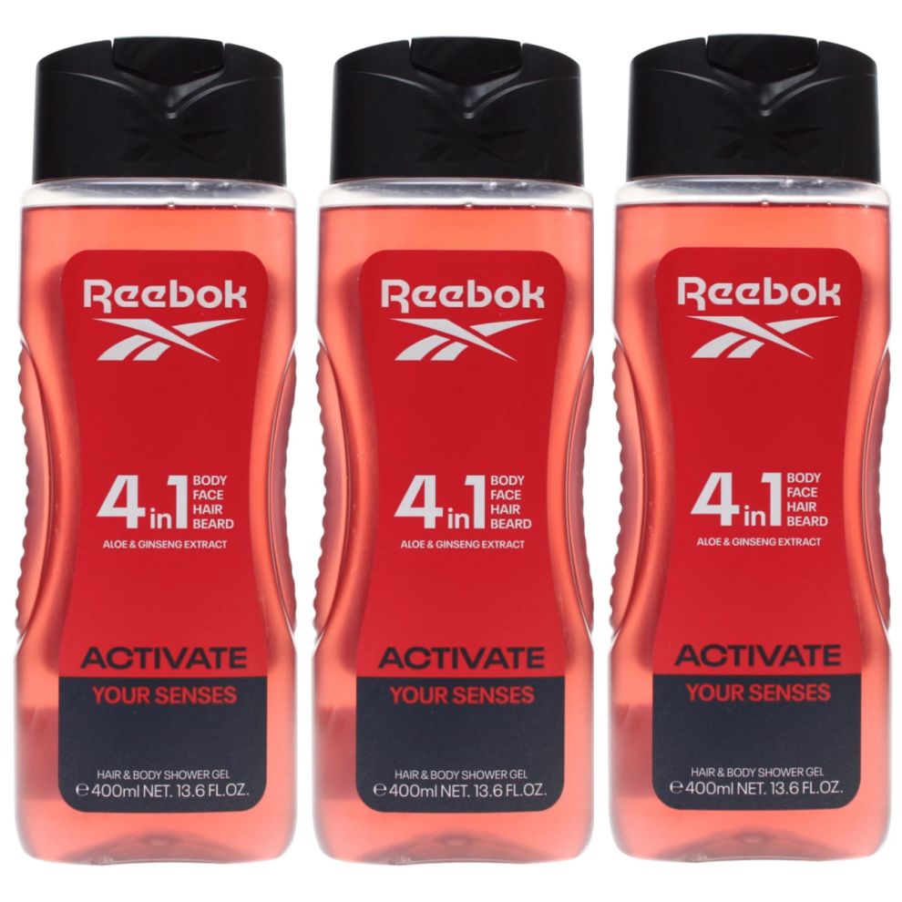 3x400ml Reebok 4-IN-1 (Body,Face,Hair,Beard) Shower Gel for Men - Activate Your Senses
